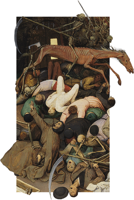 Obraz przedstawia bardzo ponurą scenerię, która budzi skojarzenia z trwającą bitwą. Jednak owa bitwa nie rozgrywa się między ludźmi lecz przeciwko armii kościotrupów, która nieuchronnie odbiera życie wszystkim ludziom. Tło jest jałowym krajobrazem, w którym wciąż rozgrywają się sceny zniszczenia takie jak topienie ludzi w rzece, wieszanie, ścinanie głów. Na pierwszym planie w centralnym punkcie śmierć z kosą na czerwonawym wychudzonym koniu prowadzi swoją armię, niszcząc świat żywych. Przerażeni ludzie uciekają do ogromnej trumny bez nadziei na zbawienie. Niektórzy próbują zmagać się z mrocznym przeznaczeniem, podczas gdy inni podporządkowują się swojemu przeznaczeniu.